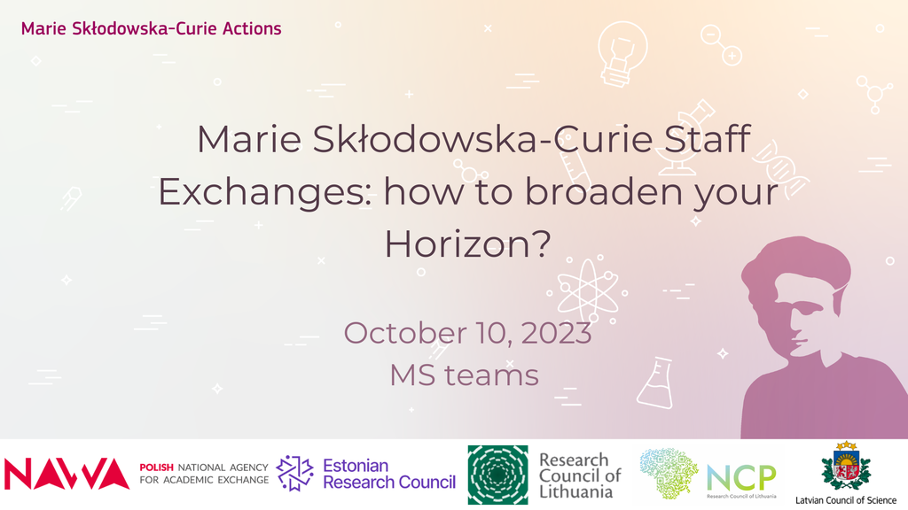 Krajowe Punkty Kontaktowe ds. Działań Marii Skłodowskiej-Curie z Polski, Litwy, Łotwy i Estonii serdecznie zapraszają na wspólne webinarium dotyczące konkursu na projekty Marii Skłodowskiej-Curie MSCA Staff Exchanges 2023.